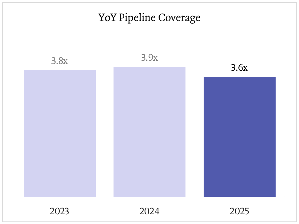 Coverage dropping to 3.6x while quota attainment stays flat means teams have less buffer as conversion rates are declining. Bad combo.
