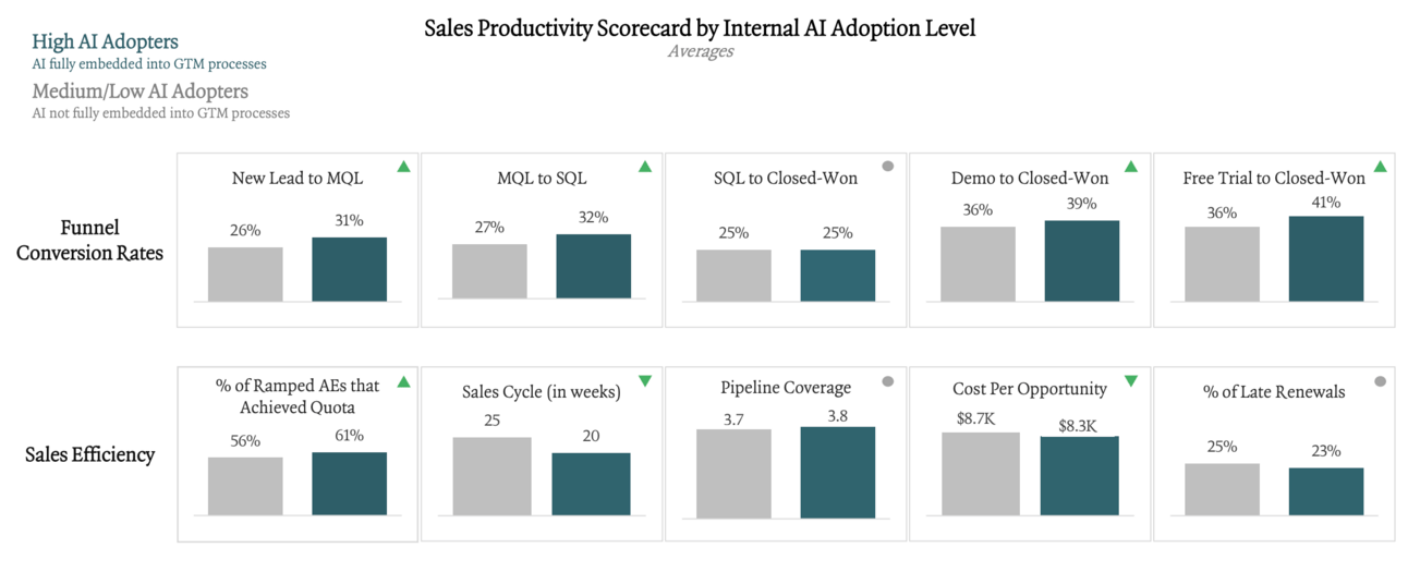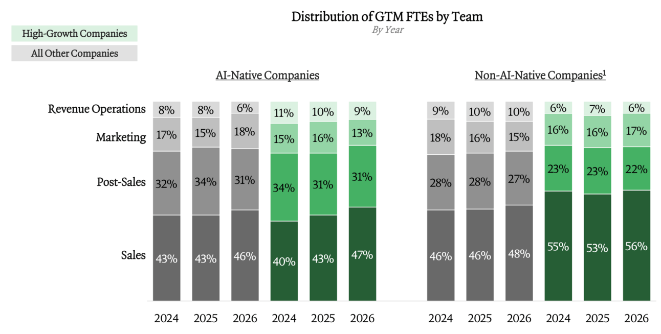 AI-native companies are doubling down on what works—putting more resources into post-sales and relationship building while using AI to make their sales team more effective. While traditional companies are still organized around the old playbook of generate more leads, make more calls.