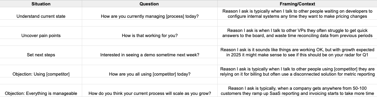 When I first start managing outbound reps, I would give new hires a list of questions to qualify prospects, identify pain points and overcome objections.
