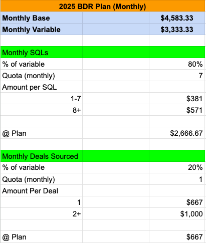 My preference is to pay reps on meetings completed or SQLs. Naturally, execs often want to align BDR comp to actual revenue so they push for alignment to revenue. More on this in the example below.